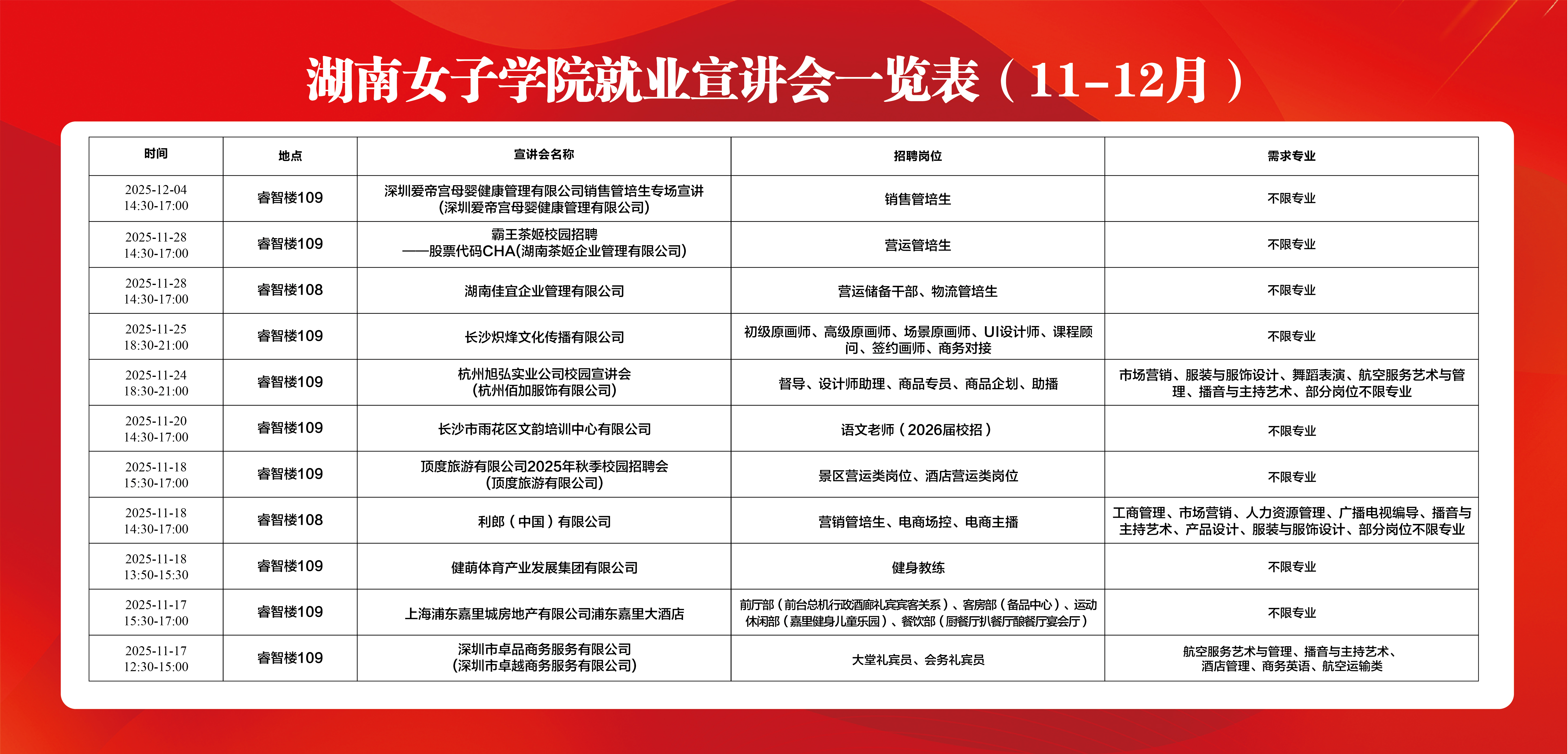 湖南女子学院就业宣讲会一览表(11-12月)